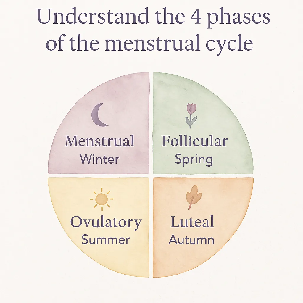 Learn how your cycle flows through four unique phases—each with its own rhythm, energy, and needs. From rest to radiance, discover how to support your body with food, movement, and grace in every phase.