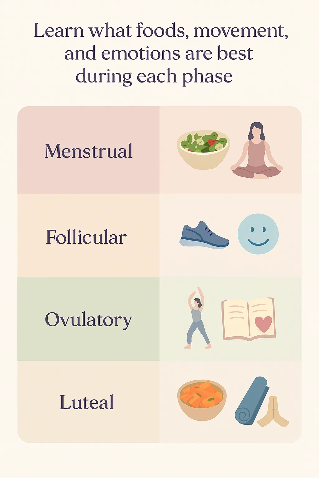 Discover how to nourish your body and soul in every phase of your cycle. Each phase has unique needs—learn what to eat, how to move, and how to honor your emotions with simple, supportive choices.